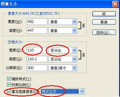 鎵撳紑涔嬪悗锛岄夋嫨“鍥惧儚澶у皬”鑿滃崟锛屽紑濮嬪鍥剧墖澶у皬杩涜鏀惧ぇ锛岃繖閲屾垜浠渶瑕佹敞鎰忎袱涓湴鏂癸細涓鏄鍕鹃“閲嶅畾鍍忕礌”锛屽苟鎶婃彃琛ユ柟娉曡瀹氫负“涓ゆ绔嬫柟”锛屼簩鏄妸鏂囨。澶у皬鐨勫崟浣嶈缃负鐧惧垎姣旓紝骞朵笖鍙噰鐢110杩欎釜鐧惧垎姣旓紝杩欏皢鎶婂浘鍍忓澶10%銆傦紙娉ㄦ剰锛氬彧鑳介10%锛屽叾浠栨瘮渚嬪苟娌℃湁濂界殑鏁堟灉锛