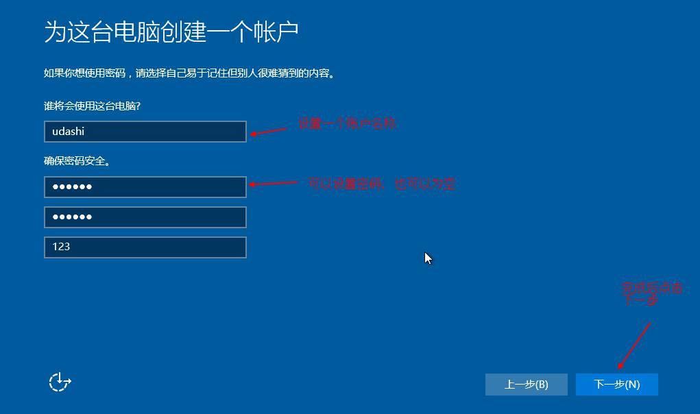 8、短暂的等待后出现为电脑创建一个账户的提示,此时输入帐户名如:udashi,密码可以设置也可以暂时不设置,这里随意。
