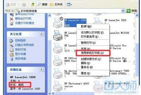 当然这里对于XP系统来说是有一定的不同的。在WindowXP操作系统当中,从脱机状态当中回复不是自动的,如下图,需要在控制面板当中找到打印机选项,在图标上右键点击,然后在菜单中选择“使用联机打印机”。