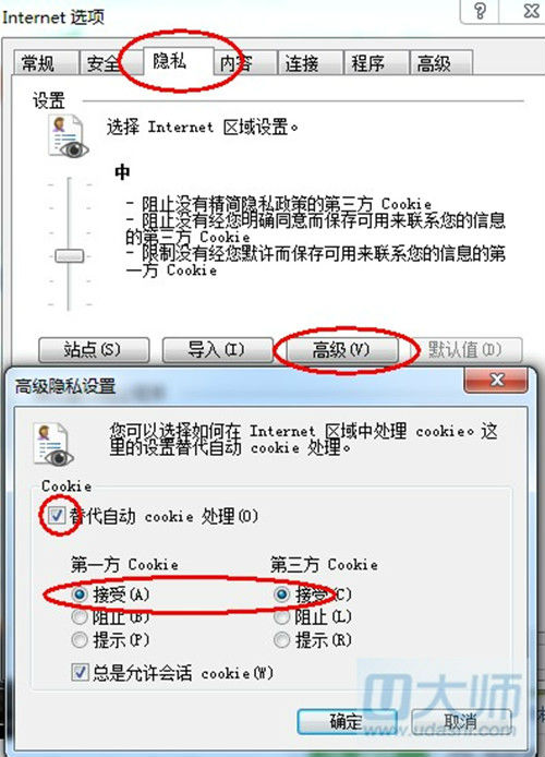 2.在打开的窗口里点击“隐私”选项卡,点击其中的“高级”按钮,在弹出的“高级隐私设置”窗口。勾选“替代自动Cookie处理”,然后将下面的“方cookie”、“第三方cookie”均设置为“接受”,后选中“总是允许会话cookie”。