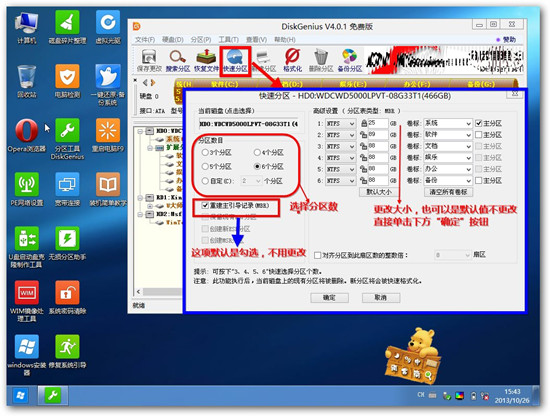 9.接着单击该界面工具栏中的“快速分区”会弹出快速分区窗口,在窗口中我们可以设置分区数目和分区大小,将这些设置完之后单击下方的“确定”按钮。