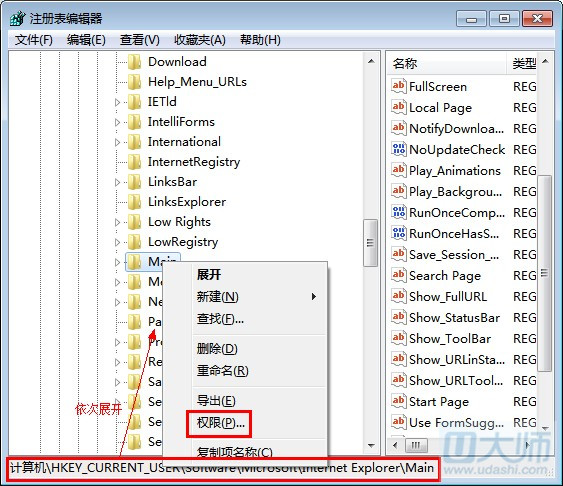 2.打开注册表编辑器后,依次展开 HKEY_CURRENT_USER\Software\Microsoft\Internet Explorer\Main 对左侧树Main节点右键——权限。正常情况下应该会有SYSTEM、RESTRICTED、Administrators等用户组,少的话就不正常。再在当前页面点击高级,点击右下角的“启用继承”按钮即可。