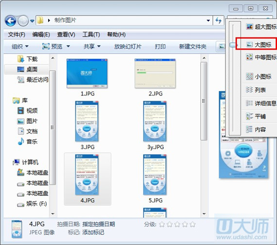 1.进到任意文件夹中并单击搜索栏下方的按钮,切换到你想要的视图这里小编选“大图标”(注意这个文件夹不能是通过Win7库定位的,一定要通过计算机-盘符-文件夹来定位)。
