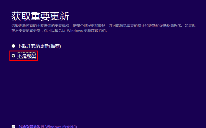 3、如图,打开安装程序窗口后,对于是否获取重新更新,选择“不是现在”,然后单击下一步。接下来,按默认的设置即可,有选项弹出单击下一步直到开始升级。