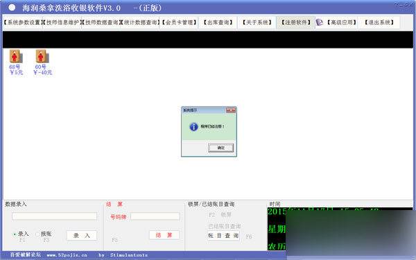 值得一提的是“桑拿洗浴收银软件”报价600元一套,而小编带来的则是已经注册过的版本,此破解版本的bug是每次打开软件要手动点击"注册"才会显示已注册,但不影响使用...绝对无毒,但杀毒软件可能会误报,请将软件加入白名单。