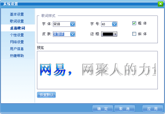 网易音乐盒拥有百万歌曲,想听就听,鼠标点点,新专辑尽在耳中。七彩歌词点缀桌面,颜色、字体任你选择,享受绚丽视听。博客(邮箱)音乐自动同步,轻轻松松玩转整个网易。本地在线随您选择,同时享受两种服务。