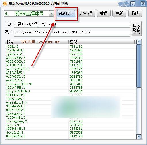 爱奇艺vip账号共享2015是一款可以获取大量免费会员账号的软件,通过该工具用户可以免费获得爱奇艺vip账号,从而免费观看vip大片和热播电视剧。软件界面友好,使用正则采集,已经更新老冰棍和分享网的正则,收录了大部分网站的共享账号,包括爱奇艺vip账号、迅雷账号等等,并且软件每月定时更新,保证所有的账号都可以免费使用。