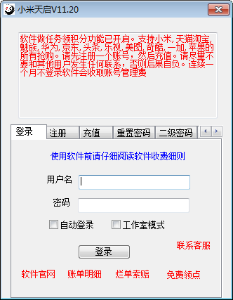 小米天启是一款界面简洁、专业的抢购工具,支持各大电商网站的商品抢购,能够快速抢购所需商品,并且支持多个账号登录,同时抢购锁哥商品,可登录一万个账号,其中一百个账号可同时进行抢购,方便快捷,适合电商用户刷单使用,无论是卖家还是卖家都可以下载使用本软件。