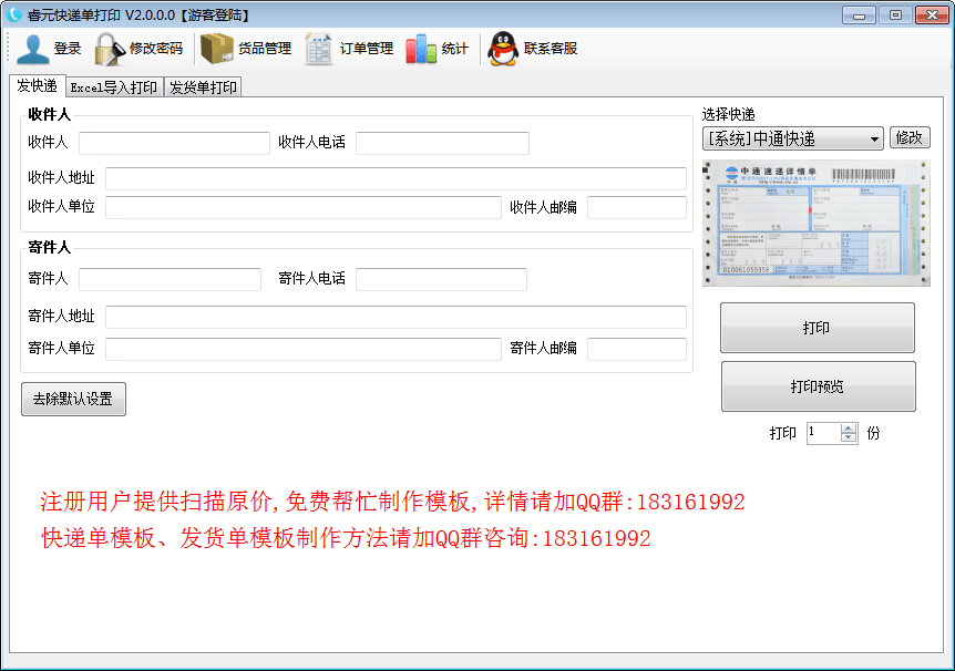睿元快递单打印软件是一款功能强大的快递单打印软件,能够从Excel中导入收件人信息进行批量打印,一旦打印过的快递单,系统会自动记录收件人信息,输入手机号即可快速找到已存在的收件人信息,还可以进行进销存管理,让管理变得更轻松!