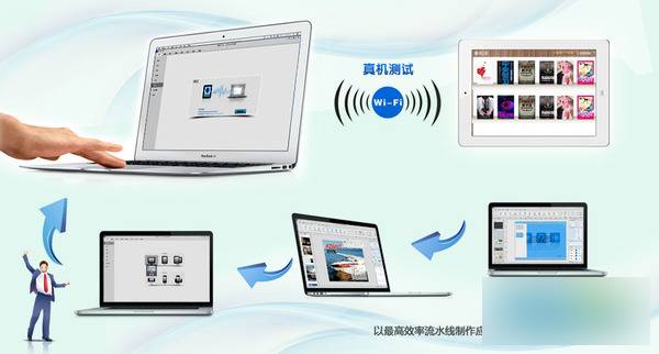 appBook支持实时真机测试功能,北京谋易软件汲取数字加工领域先进的制作理念,世界首创了编辑端实时真机测试技术,通过在测试设备上安装测试端软件,实现在真机上测试应用制作效果。 真正做到所见即所得