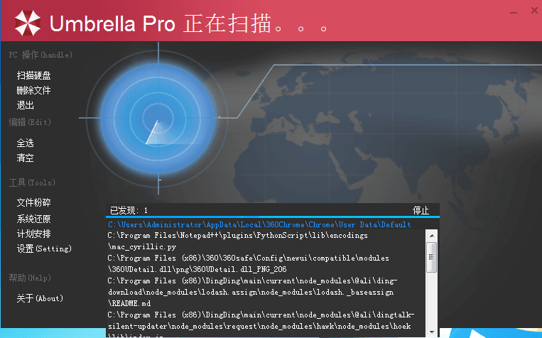 保护伞清理(UmbrellaProCleaner)是一款非常小巧的电脑清理工具,该软件非常类似电影中《生化危机的》界面,软件功能比较少,主要用来清理垃圾以及粉碎文件,也包含电脑还原等等功能,占用资源非常少!