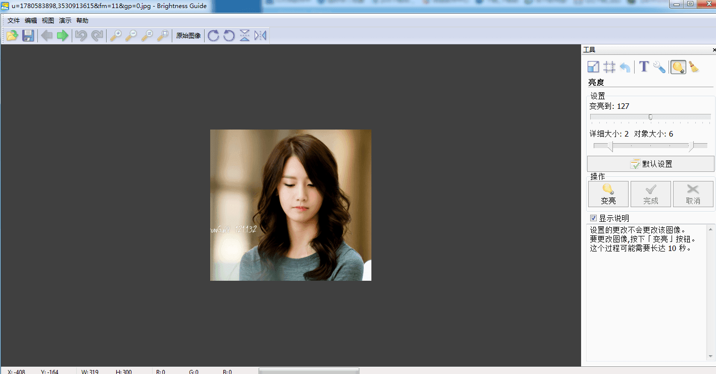 照片亮度处理工具是一款好用的照片亮度调整工具,可以轻松的帮助你将各种原因造成的拍摄画面阴暗的照片,重新变的清晰明亮起来。软件自带演示教程,对于初学者来说,使用起来非常方便。