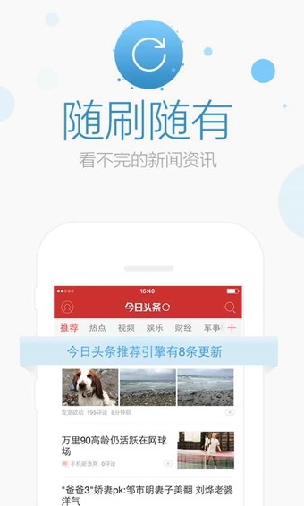 今日头条,一款优秀的新闻阅读软件。秒懂你的阅读喜好,秒杀你的碎片化时间。 聚合网易、新浪、腾讯、百度、凤凰、搜狐等各大门户的全平台资讯, 涵盖热点、科技、财经、社会、国际、娱乐、段子、图片、体育、军事、汽车... 随时随地分享内容到微博、微信、朋友圈、QQ空间。