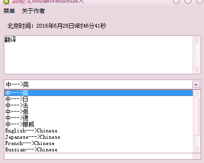 全自动翻译朗读机器人是一款非常好用的多语言语音翻译软件,软件界面简洁美观,给人的感觉非常舒服,功能按钮也十分直观,便于操作。这款翻译软件支持将英语、法语、德语、日语、俄语、挪威语翻译成汉语,或者将汉语转换为以上语言。