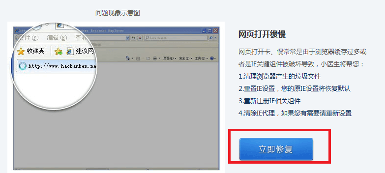 4、进入“网页打开慢”界面,点击“立即修复”即可;