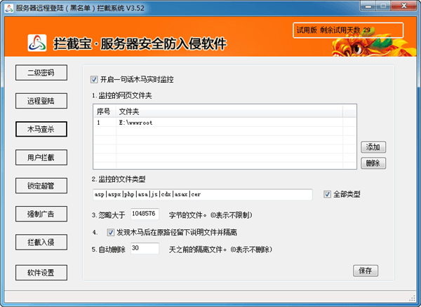拦截宝是一款专业的服务器安全防护软件,主要针对服务器被入侵、网站入侵被挂马、服务器被提权等黑客行为进行防护。拥有二级密码登录,服务器远程拦截,超级锁定,木马查杀等强大功能,全方位保护您的服务器安全!