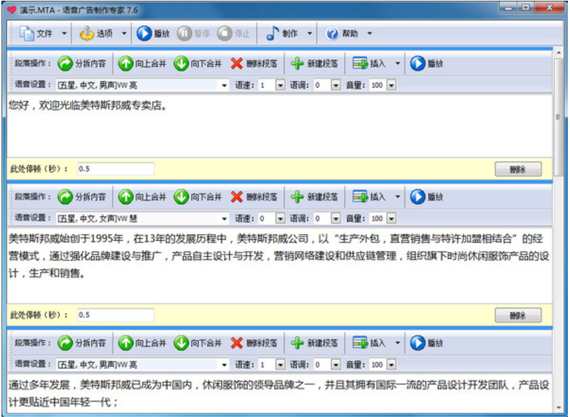 同时,本产品特有的“分段调整”功能,可让您精细调整语音广告中的每句话、每个词的语速、音调和读法,从而避免了传统的语音制作软件通篇到头只能使用同一个语速和音调而带来的平淡和乏味,令语音张弛有度,随心所欲