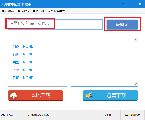 零视界网盘解析助手是一款功能实用的网盘地址解析软件,操作简单,只需要将网盘地址输入到软件解析框内,然后点击“解析地址”即可显示网盘的名称、大小以及日期等相关信息,并且软件还支持迅雷和本地两种下载模式。