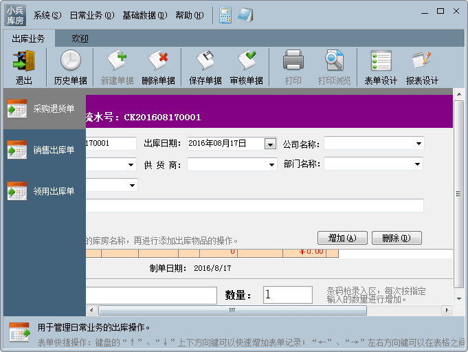 小兵库房管理系统是一款简洁实用的库存管理应用软件,界面简洁质感,主要包括基础数据、出入库数据、统计报表、数据导入导出、系统安全管理、数据打印等多种实用功能,能够帮助管理者更加系统化管理店内商品。