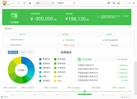 平安金融卫士将您所有的信用卡进行统一管理,便于您掌握信用卡的可用额度、已透支金额、消费分布等。同时汇集多张信用卡账单及还款日,方便您进行还款。账单时间轴帮您全面掌握财务状况。