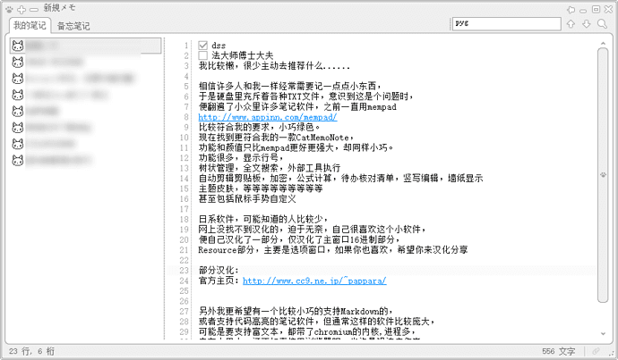 CatMemoNote是一款笔记本工具,小巧的体积,简洁的面板,风格比较卡通,功能却不俗。拥有鼠标手势自定义,树状管理、全文搜索、待办清单、竖写编辑、主题皮肤等功能,非常适合办公使用。