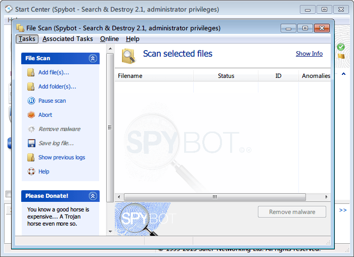 Spybot - Search & Destroy 2是 Spybot - Search & Destroy的新版,与旧版本一样,该软件主要功能是对计算机系统中的木马病毒等恶意病毒进行扫描查杀,能可有效的免疫病毒的威胁,软件陪着杀毒软件使用效果会更好。另外在老版本的基础上,该软件的ui重新进行了设计,界面看起来更加简洁,工具也变得更多,虽然是没有了中文界面,但是操作依然简单明了,并不妨碍使用。