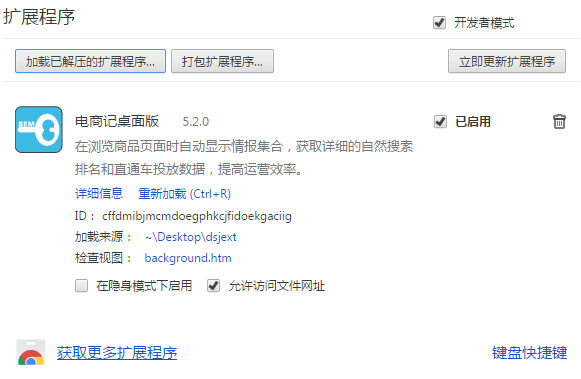 3、选中页面右上角的“开发者模式”,然后点击页面左侧出现的“加载正在开发的扩展程序”;4、选择扩展程序目录为刚才在计算机中解压缩的目录(如d:\dsjext),即可;5、如浏览器在安装时有“允许访问敏感页面”或者“在隐身模式下启用”选项,请设置为允许,插件才能在页面上运行。