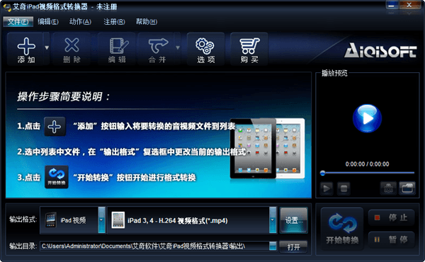 艾奇iPad视频转换器是一款功能强大的iPad视频格式转换器,软件采用傻瓜式操作,一键就可以完成转换。支持将任意视频格式批量转换成iPad兼容的格式,并且可以对视频进行剪辑、剪切,合并等操作。你可以边转换边看视频,实时预览效果。采用多CPU协同转换,转换速度快极快,是您进行iPad视频转换的佳选择。