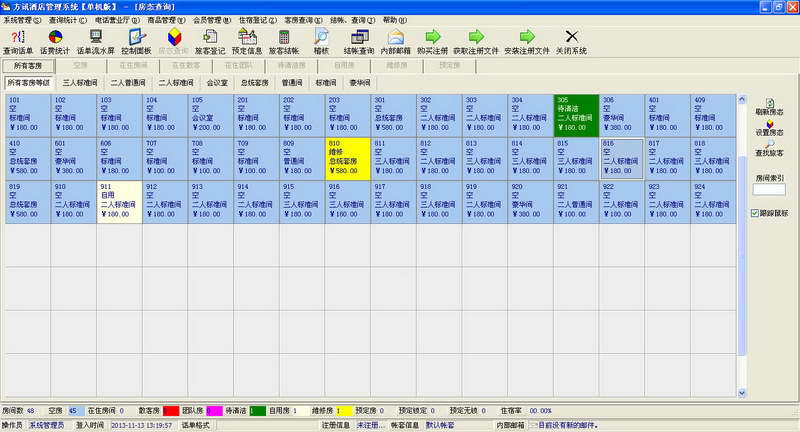 客房管理系统的各种房态由不同的颜色、字体、图标符号区分,使操作员直观了解房态,用户可以设置酒店房态的颜色、字体、图标符号,满足酒店个性选择。