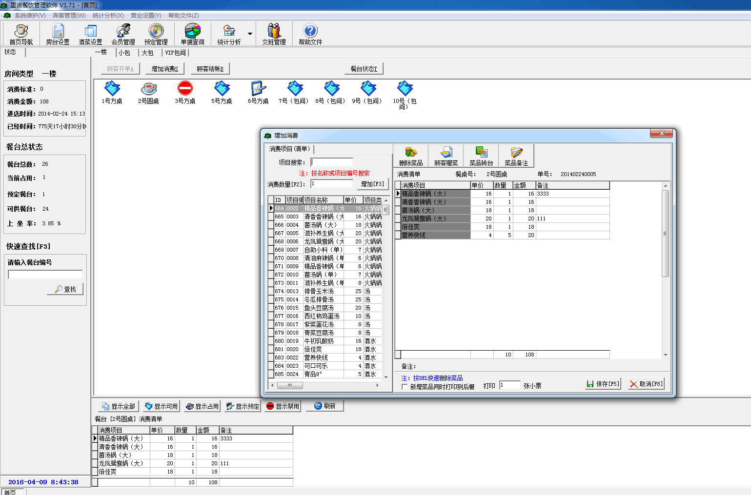 点菜鼠标轻击选中菜品,输入相应消费数量,即可点菜成功,人性化设计,操作速度快;可在客户报上所要消费项目后后即刻输入完成;且可同时打印清单到后厨,功能灵活,多种付款方式可以选择,房台可设定低消费、可设固定服务费或按消费金额比例收取服务费,消费品可以设固定价格、可折扣计价,软件功能灵活。