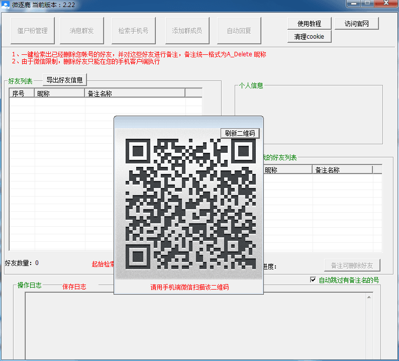 微逐鹿是全网实用的微信好友管理软件,能够帮助微信用户快速找出删除自己的好友,具有批量群发好友,公众号,微信群的功能,批量加微信群好友,批量检测手机号是否开通微信,更多使用功能开发中...