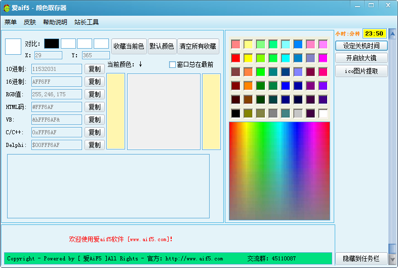 爱aif5颜色取存器是一款取色工具,有七个取色区域,可同时记录七种颜色屏幕取色小工具适合做网站,网页设计,绘画,PS调色的朋友并且能根据你取的颜色得到你想要的代码。